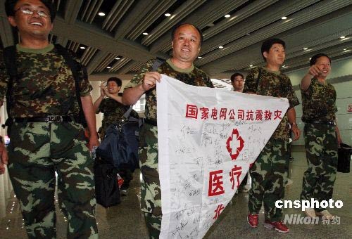 6月1日,國家電網(wǎng)公司抗震救援隊和北京電力醫(yī)院抗震救援醫(yī)療隊從災(zāi)區(qū)回到北京。中新社發(fā) 錢興強 攝