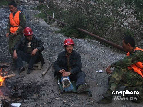 從一名被營救者口中得知有三名礦工被困礦區(qū)后,中國空降兵某部特種大隊于5月31日上午,乘坐香港特區(qū)政府飛行服務(wù)隊的直升機前往綿竹清平鄉(xiāng)山里搜救3名川龍有限公司的礦工。當(dāng)日兩名受傷礦工被找到。由于天氣原因,6月1日才被飛機運出。圖為礦工被救后等待飛機救援。中新社發(fā) 李磊 攝