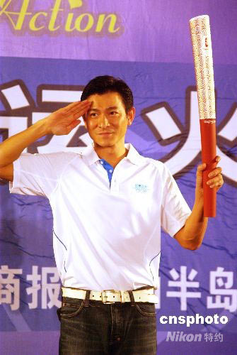 6月3日,在海南三亞進(jìn)行的“愛(ài)心呵護(hù) 陽(yáng)光行動(dòng)”愛(ài)心大使奧運(yùn)火炬義拍活動(dòng)中,香港藝人劉德華拿出自己在香港傳遞奧運(yùn)圣火時(shí)的奧運(yùn)火炬進(jìn)行現(xiàn)場(chǎng)義拍,拍得人民幣190萬(wàn)元,拍賣所得將全部用于四川地震災(zāi)區(qū)教育事業(yè)。圖為劉德華在展示自己的奧運(yùn)火炬。中新社發(fā) 尹海明 攝