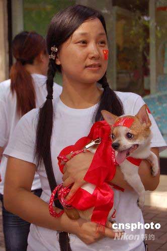一名女孩帶著一身披紅的寵物小狗在街頭等待奧運(yùn)圣火到來(lái)。中新社發(fā) 劉萬(wàn)強(qiáng) 攝