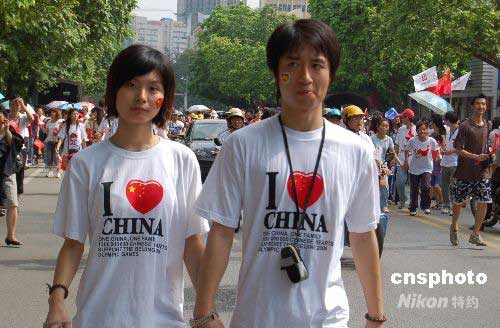 一對年輕情侶牽手街頭迎接奧運圣火。中新社發(fā) 劉萬強(qiáng) 攝