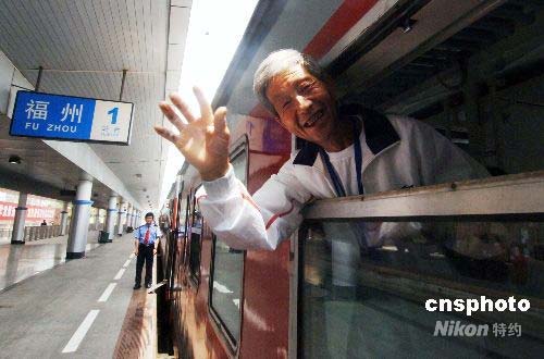 圖為列車發(fā)車前呂天其老人與前來送行的有關(guān)人員揮手道別。中新社發(fā) 劉可耕 攝