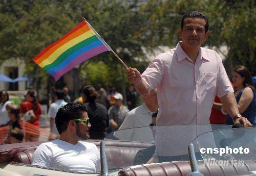 洛杉磯市長(zhǎng)維拉萊格薩揮舞彩虹旗參加同性戀者大游行,以示支持。中新社發(fā) 張煒 攝