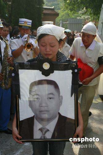丁剛的女兒捧著父親的遺相含淚走過送別的人群。 中新社發(fā) 鐘 敏 攝