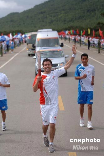 6月10日,奧運(yùn)圣火在云南麗江傳遞,圖為168號(hào)火炬手法國(guó)人尼爾·格雷高(音譯)正在傳遞火炬。中新社發(fā) 廖攀 攝