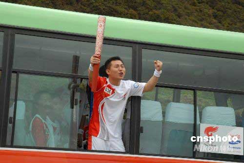 一位火炬手結束傳遞活動前往結束儀式途中,手舉祥云火炬,高喊“中國加油”。中新社發(fā) 石雨 攝