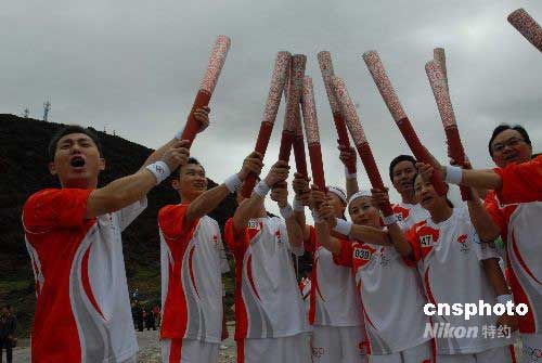 在圣火傳遞結(jié)束儀式的現(xiàn)場(chǎng),已經(jīng)傳遞完成的10余位火炬手高舉祥云火炬齊聲為中國(guó)加油,祝福北京奧運(yùn)。 中新社發(fā) 石雨 攝