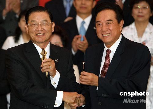 峽兩岸關(guān)系協(xié)會(huì)會(huì)長陳云林(右)與臺(tái)灣海峽交流基金會(huì)董事長江丙坤在簽署“兩岸周末包機(jī)”和“大陸居民赴臺(tái)旅游”協(xié)議后,交換簽字筆。中新社發(fā) 任晨鳴 攝