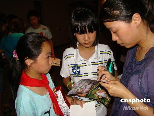 孩子們讓在陽光活動(dòng)中一直陪伴的阿姨簽名。中新社發(fā) 付美斌 攝