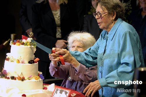 女同性戀者八十七歲的德爾·馬。ㄗ螅┖桶耸臍q的菲莉斯·里昂(右),在相愛五十五年后,終于領(lǐng)取了結(jié)婚證書。中新社發(fā) 陳鋼 攝