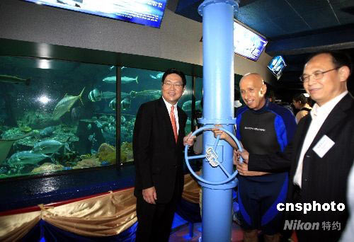 香港特區(qū)商務(wù)及經(jīng)濟(jì)發(fā)展局局長馬時(shí)亨(左)、全國水生野生動(dòng)物保護(hù)分會(huì)會(huì)長李彥亮(右)、海洋公園主席盛智文在海洋公園海洋館為中華鱘新居揭幕。中新社發(fā) 王麗南 攝
