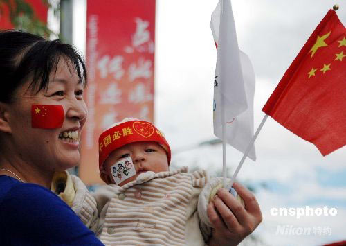 出生才60天的一名小寶寶周思璇同媽媽一道在街頭喜迎奧運(yùn)火炬到達(dá)高原圣城。 中新社發(fā) 周波 攝