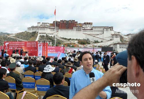 圖:境外記者現(xiàn)場報(bào)道奧運(yùn)火炬?zhèn)鬟f