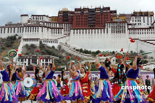 圖:藏族民眾布達(dá)拉宮廣場歡慶奧運火炬?zhèn)鬟f