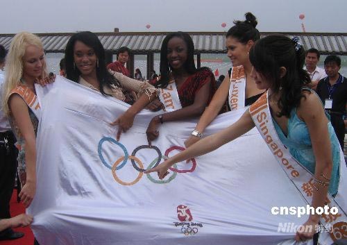 6月23日,參加一年一度世界休閑小姐總決賽的佳麗們來(lái)到蘇州中國(guó)珍珠寶石城舉行巡游活動(dòng)。在珍珠湖畔,佳麗們親手穿線串珠,共同制作了由20888顆淡水珍珠匯成的奧運(yùn)五環(huán)旗,并奉上“預(yù)祝2008北京奧運(yùn)會(huì)舉辦成功”的美好祝愿。 中新社發(fā) 黃瑩 攝
