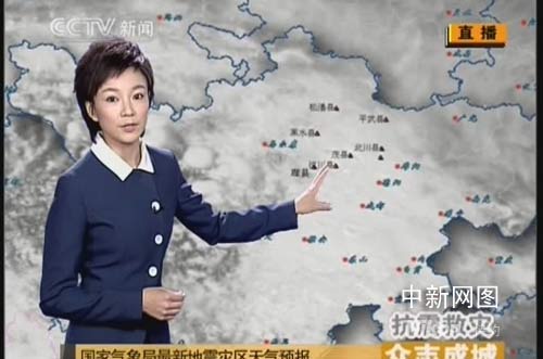 王藍(lán)一在《眾志成城 抗震救災(zāi)》直播中播報(bào)天氣預(yù)報(bào)。