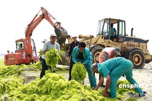 圖為乳山市民眾在近海清理海灘與近海的滸苔。中新社發(fā) 劉國(guó)賢 攝