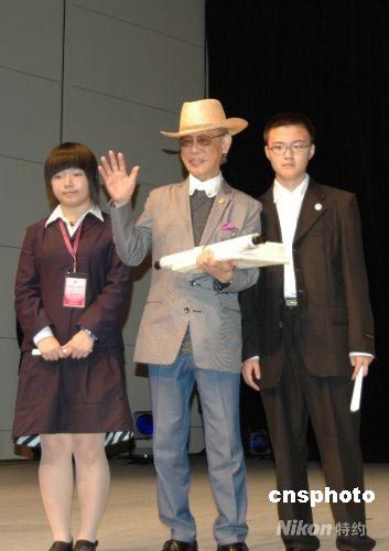 八十九歲高齡的日本漫畫家協(xié)會理事長柳瀨 嵩向來自南山中學(xué)的學(xué)生代表勾梁丁、蘇思宇同學(xué)表達(dá)深切的問候,并接受了兩位同學(xué)的禮物--南山中學(xué)的畫冊。中新社發(fā) 朱沿華 攝