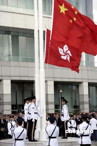 七月一日,香港金紫荊廣場舉行盛大升旗儀式,慶祝香港回歸祖國十一周年。特首曾蔭權(quán)及特區(qū)政府官員、中央駐港聯(lián)絡(luò)辦公室、外交部駐港特派員公署、駐港部隊(duì)及眾多民眾參加。中新社發(fā) 王麗南 攝