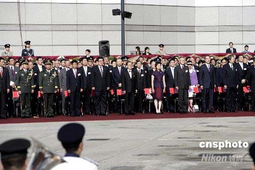 香港特區(qū)行政長(zhǎng)官曾蔭權(quán)及特區(qū)政府官員、中央駐港聯(lián)絡(luò)辦公室、外交部駐港特派員公署、駐港部隊(duì)及眾多民眾參加升旗儀式。中新社發(fā) 王麗南 攝