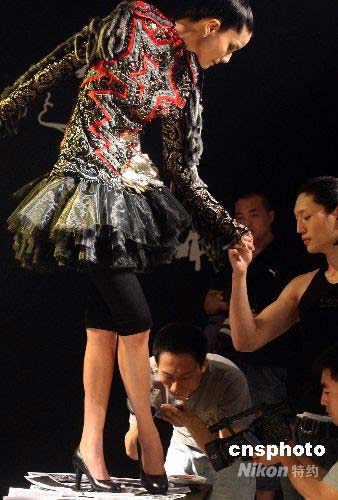 7月1日晚,“北京凱萊希模特學校2008年畢業(yè)匯報表演”在北京舉行。來自美國芝加哥大學博士Angela Zito編導創(chuàng)意的高跟鞋藝術(shù)秀別具特色,13位女模特,在中國傳統(tǒng)文士的書桌上表演走,坐,躺。男同學的加入令高跟鞋展現(xiàn)出男性和女性之間糾結(jié)的關(guān)系。名模陳娟紅最后登上書桌,穿上一雙鞋跟已經(jīng)被刻上圖章的高跟鞋,把圖章蓋在由這次活動參與人員提供的照片上。這些照片代表著人們愿意重新體味過去的生活情景,該怎樣面對記憶,是把他們?nèi)釉谝贿厜m“封”,還是不斷地重新“開”啟,探究著占有的象征,在現(xiàn)世和回憶之間的重新定位。圖為名模陳娟紅書桌上展示高跟鞋藝術(shù)秀。中新社發(fā) 錢興強 攝