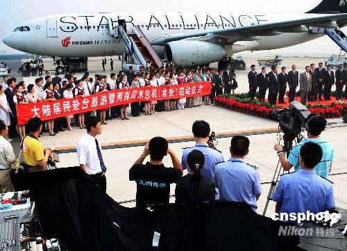 7月4日上午8時(shí)30分,中國(guó)大陸第一批赴臺(tái)灣游客,從北京首都機(jī)場(chǎng)乘中國(guó)國(guó)際航空公司CA185航班起飛,預(yù)計(jì)13點(diǎn)到達(dá)臺(tái)北機(jī)場(chǎng)。國(guó)務(wù)院臺(tái)辦、國(guó)家旅游局、北京市政府有關(guān)官員到機(jī)場(chǎng)歡送旅游團(tuán)。今天,兩岸將共有11家航空公司的18班包機(jī)往返兩岸。大陸的國(guó)航、東航、南航、海航、上航和廈航等6家航空公司,將分別由北京、上海(浦東)、廣州、廈門和南京5個(gè)首批開放航點(diǎn)往返臺(tái)北桃園和松山兩個(gè)機(jī)場(chǎng);臺(tái)灣的華航、華信、長(zhǎng)榮、立榮和復(fù)興航空公司則分別由臺(tái)北、臺(tái)中、高雄、花蓮、澎湖飛往北京、上海、廣州、廈門。據(jù)悉,搭乘4日首航兩岸周末包機(jī)的大陸居民赴臺(tái)旅游首發(fā)團(tuán)共有約760名團(tuán)員,由海峽兩岸旅游交流協(xié)會(huì)會(huì)長(zhǎng)邵琪偉擔(dān)任團(tuán)長(zhǎng)。中新社發(fā) 宋吉河 攝
