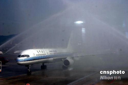 七月四日上午,大陸居民赴臺旅游暨兩岸周末包機陸續(xù)抵達(dá)臺灣的機場。來自大陸福建省的首發(fā)團在松山機場接受噴水洗塵的禮遇。中新社發(fā) 徐長安 攝
