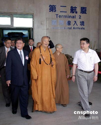 南京作為兩岸周末包機新增航點,首次承擔包機任務。臺灣佛光山星云法師(中)特意搭乘南京包機返臺。中新社發(fā) 徐長安 攝