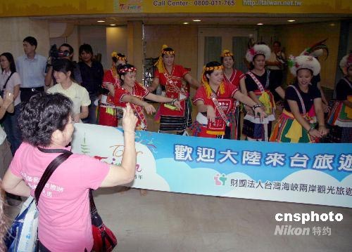 臺(tái)灣少數(shù)民族在松山機(jī)場第二航廈出口載歌載舞迎接到來的大陸觀光客。中新社發(fā) 徐長安 攝