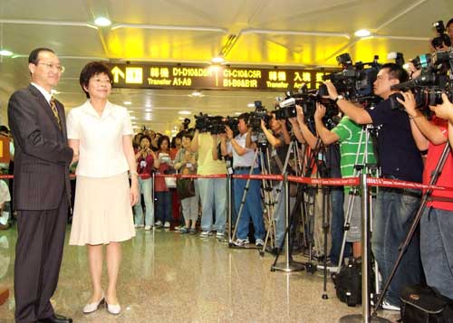 由海峽兩岸旅游交流協(xié)會會長邵琪偉率領(lǐng)的大陸居民赴臺旅游(北京)首發(fā)團4日中午12時20分許乘國航包機抵達臺北桃園機場。臺灣海峽兩岸觀光旅游協(xié)會(臺旅會)會長賴瑟珍(右)到桃園機場迎接邵琪偉一行。(“中央社”圖)