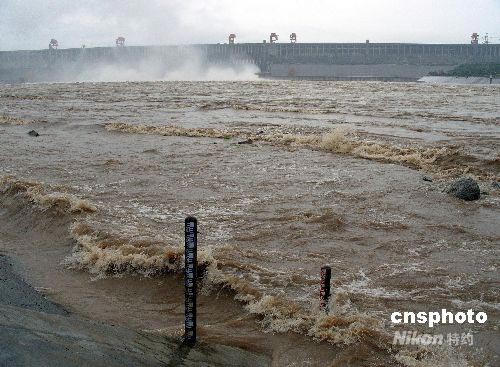 2008年7月5日,大雨中的三峽大壩開(kāi)啟6個(gè)深孔泄洪,每秒下泄流量11000立方米,這是三峽工程2008年首次開(kāi)閘泄洪。連日來(lái),長(zhǎng)江三峽庫(kù)區(qū)持續(xù)大到暴雨,長(zhǎng)江上游來(lái)水猛漲,7月5日10時(shí)三峽入庫(kù)流量達(dá)34500立方米/秒,三峽壩前水位為145.79米。據(jù)長(zhǎng)江防汛抗旱總指揮部披露,預(yù)計(jì)未來(lái)幾天長(zhǎng)江上游仍將持續(xù)降雨,三峽入庫(kù)流量將持續(xù)超過(guò)26000立方米/秒,三峽大壩將保持持續(xù)泄洪狀態(tài)。中新社發(fā) 劉君鳳 攝