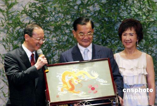 7月5日,中國國民黨榮譽主席連戰(zhàn)夫婦及部分國民黨高層在臺北會見到訪的海峽兩岸旅游交流協(xié)會會長邵琪偉一行。連戰(zhàn)表示,大陸居民赴臺旅游和兩岸周末包機(jī)的實現(xiàn),不僅為兩岸關(guān)系和平發(fā)展的偉大目標(biāo)作出了貢獻(xiàn),更為中華民族興盛發(fā)展寫下了新的一頁。會見之后,連戰(zhàn)和邵琪偉互贈禮物。禮物皆與“龍”有關(guān)。連戰(zhàn)贈給邵琪偉的禮物是由臺灣新竹工藝大師制作的琉璃“吉祥云龍”,“象征兩岸同屬中華民族,都是炎黃子孫,期待將來有更多的客運、貨運包機(jī)飛翔在兩岸的天空中”。邵琪偉贈送給連戰(zhàn)的是湘繡龍紋雙面繡。中新社發(fā) 黃少華 攝