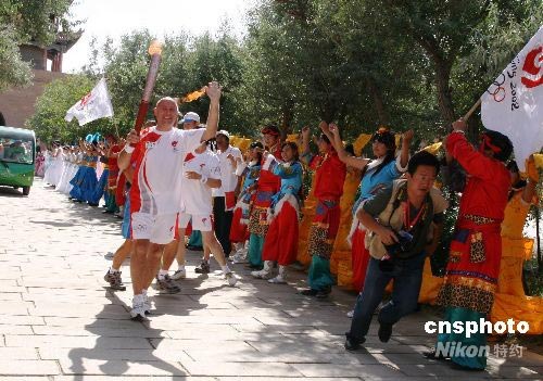 第201棒火炬手、德國(guó)汽車工程師羅曼在嘉峪關(guān)關(guān)城內(nèi)傳遞。中新社發(fā) 周兆軍 攝