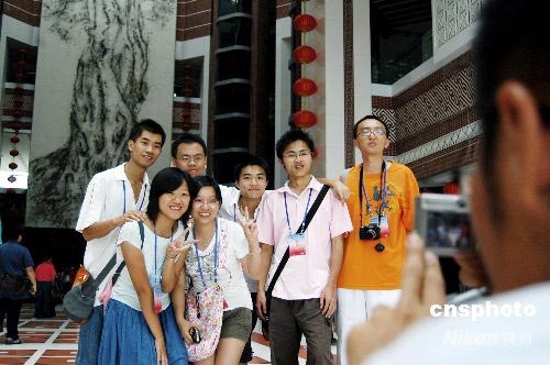 7月7日下午,參加海峽西岸2008年臺胞青年夏令營的110多名臺胞青年來到位于古城泉州的中國閩臺緣博物館。圖為臺灣青年在閩臺緣鎮(zhèn)館之寶《同文同種同根生》世界面積最大火藥壁畫前合影留念。 中新社發(fā) 傅丹丹 攝