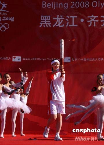7月13日,北京奧運火炬在齊齊哈爾傳遞,第一棒火炬手是花樣滑冰全國冠軍劉艷。劉艷是中國在花樣滑冰女子單人滑項目上最具實力的選手,被稱為“女單一姐”。 中新社發(fā) 周兆軍 攝