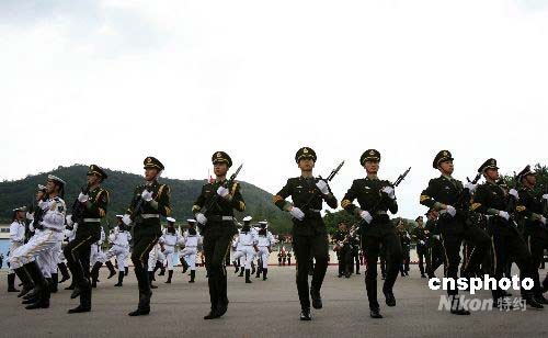 圖為駐港部隊槍械團體操表演。中新社發(fā) 張勤 攝