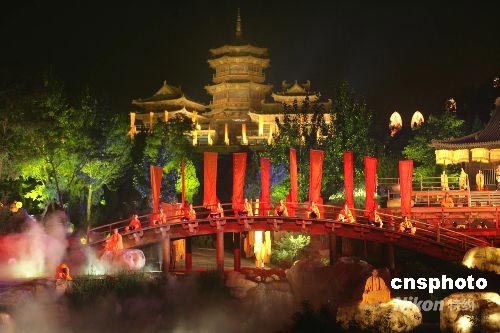 7月14日晚,一部名為《禪宗少林》的音樂大典在河南登封的嵩山實景演出,參加演出的演員達600人!抖U宗少林》由著名音樂家譚盾擔任藝術(shù)總監(jiān)和音樂原創(chuàng),梅帥元任導演。演出地點位于距嵩山少林寺7公里處的一片峽谷中,分為《水樂》《木樂》《風樂》《光樂》《石樂》五個樂章,吸引眾多游客觀看。該節(jié)目將成為中原文化旅游的一大亮點。中新社發(fā) 趙雋 攝