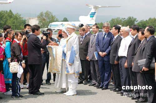 圖為中國駐俄羅斯大使劉古昌、俄濱海邊疆區(qū)行政長官達(dá)里金、俄總統(tǒng)駐遠(yuǎn)東區(qū)副代表捷列霍夫等專程到機(jī)場迎接。中新社發(fā) 田冰 攝