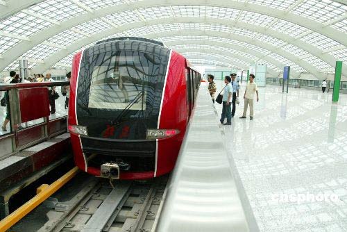 北京地鐵機(jī)場(chǎng)專線駛?cè)胧锥紮C(jī)場(chǎng)T3航站樓。中新社發(fā) 富田 攝