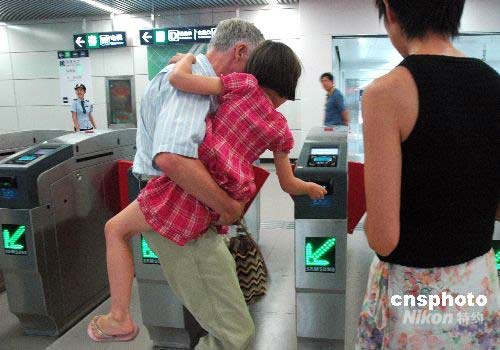 圖為在機(jī)場(chǎng)線三元橋車站入口處,外國(guó)游客一家人正在投票進(jìn)站。中新社發(fā) 張雙雙 攝
