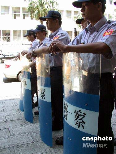 7月21日上午,臺北地方法院開庭審理臺灣地區(qū)前領導人陳水扁等被控誹謗案,陳水扁首度以被告身份到庭應訊。臺北市警方動員多名警力會同法警維持場外秩序。中新社發(fā) 徐長安 攝