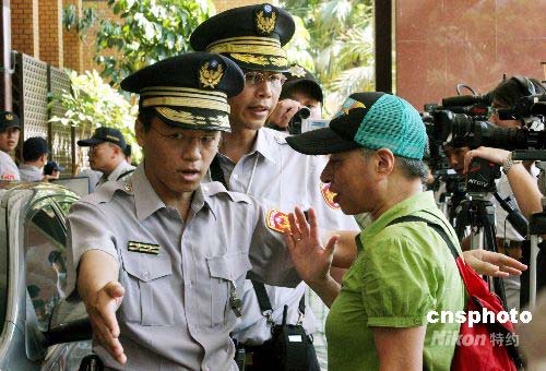 7月21日,臺灣前海軍中將雷學(xué)明等控告陳水扁等人誹謗案在臺北地方法院開庭。這是是陳水扁卸任臺灣領(lǐng)導(dǎo)人后首度至法院出庭,創(chuàng)下卸任領(lǐng)導(dǎo)人以被告出庭的首例。為此,大批警方出動維持秩序,不過仍發(fā)生陳水扁上午在步入法院時遭一民眾踹一腳的意外。圖為警方在法院門口勸離一民眾。中新社發(fā) 黃少華 攝