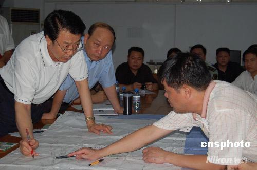 國家安監(jiān)總局局長王君(左一)連夜趕赴廣西百色,并于7月22日凌晨抵達(dá)百色煤礦透水事故現(xiàn)場,部署營救工作。中新社發(fā) 劉萬強(qiáng) 攝