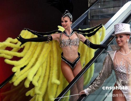 法國巴黎著名的麗都夜總會的舞娘在巴黎老佛爺百貨男裝館,為游人和顧客獻上風情萬種的火辣演出。中新社發(fā) 王倩 攝