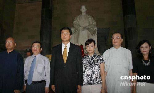臺(tái)北縣長周錫瑋率臺(tái)北縣南京參訪團(tuán)一行十人拜謁南京中山陵,在孫中山像前合影。中新社發(fā) 朱曉穎 攝