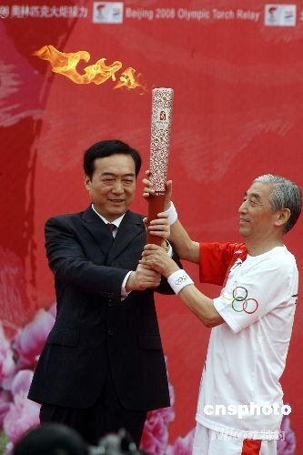 7月27日,河南省委副書記陳全國將火炬交于河南洛陽第一棒火炬手張海(右)手中,張海是當(dāng)代中國書法掌門人。當(dāng)日,北京奧運接力到河南省洛陽市。中新社發(fā) 慎重 攝