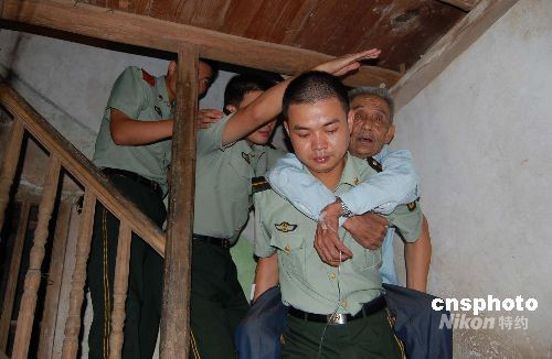 七月二十八日,隨著臺風(fēng)“鳳凰”逼近福建沿海,駐守福建沿海一線的邊防官兵正全力準(zhǔn)備,防抗臺風(fēng)襲擊。圖為福建福清江陰鎮(zhèn)東霄村的一棟危房中,當(dāng)?shù)剡叿琅沙鏊俦岩恍袆?dòng)不便的老伯轉(zhuǎn)移到安全地帶。中新社發(fā) 朱明海 攝