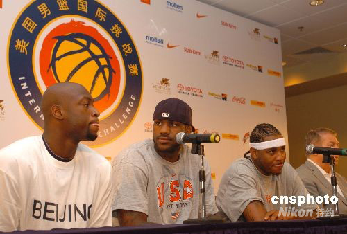 圖為七月二十八日抵達(dá)澳門的美國(guó)球員德懷恩·韋德(左一)、勒布朗·詹姆斯(左二)及卡梅隆·安東尼出席記者會(huì)。美國(guó)國(guó)家男籃隊(duì)將于七月三十一日及八月一日在澳門與土耳其及立陶宛隊(duì)進(jìn)行兩場(chǎng)奧運(yùn)熱身賽。中新社發(fā) 畢永光 攝
