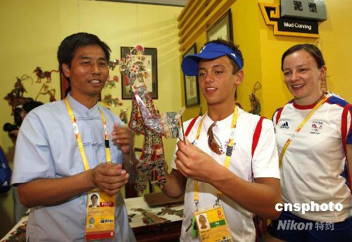 7月29日,北京奧運(yùn)村中國(guó)文化展示區(qū),來(lái)自英國(guó)的運(yùn)動(dòng)員迷上中國(guó)皮影戲,開(kāi)心地向服務(wù)人員學(xué)習(xí)表演技藝。中新社發(fā) 杜洋 攝