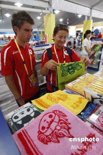 7月29日,北京奧運(yùn)村購(gòu)物區(qū),來(lái)自波蘭的選手在挑選帶有“福娃”圖案的毛巾。中新社發(fā) 杜洋 攝
